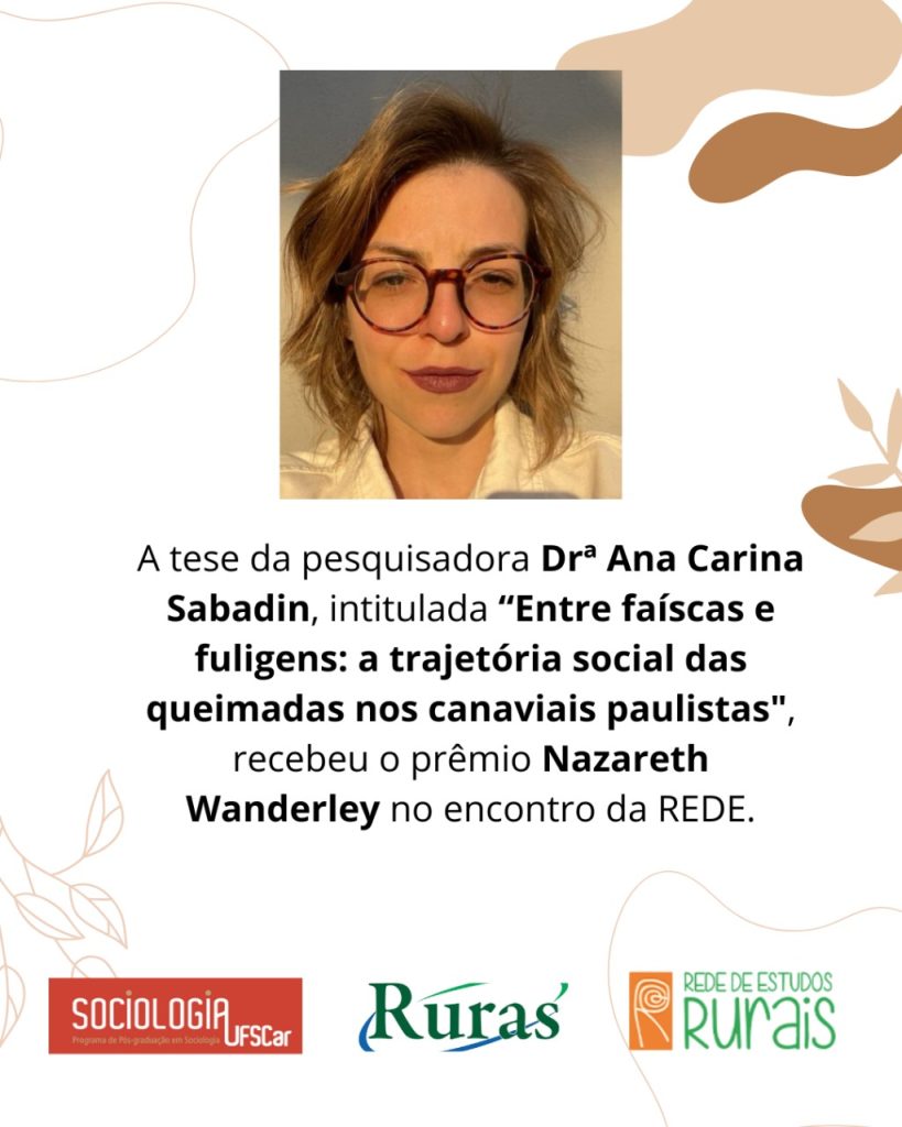 A tese intitulada “Entre faíscas e fuligens: a trajetória social das queimadas nos canaviais paulistas”, defendida pela Drª Ana Carina Sabadin, pesquisadora vinculada ao RURAS, foi premiada no 11° Encontro da Rede de Estudos Rurais, que ocorreu em Vitória da Conquista, Bahia, nos dias 1 a 5 de setembro de 2025. Sob orientação do Prof° Dr° Rodrigo Contante Martins, no Programa de Pós-Graduação em Sociologia da UFSCAR, o trabalho traz uma reflexão pertinente e atual sobre a trajetória social do fogo nos canaviais, identificando uma trajetória específica que leva ao apagamento de um debate que se estende por décadas no contexto paulista.